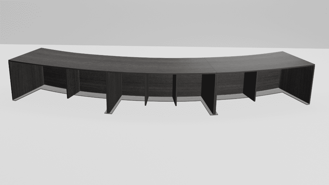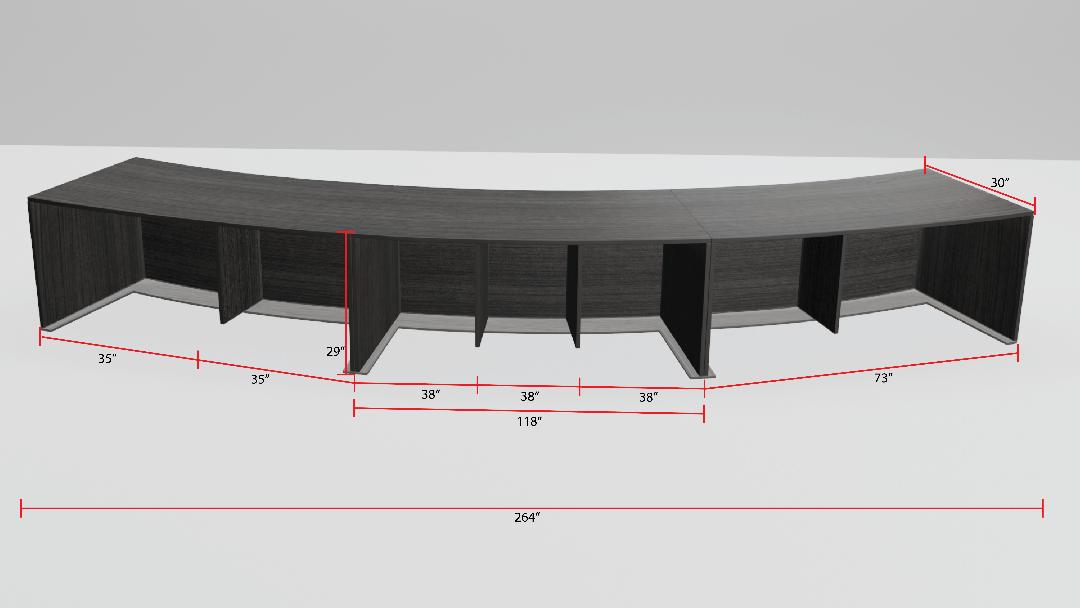 CRESCENT SHAPED COUNCIL CHAMBERS DESK. DAIS FURNITURE SEATS 7. DESIGNED AS A COST ALTERNATIVE TO OUR ARD CUSTOM WOOD DESIGN. >>Click to email for a quote.<<