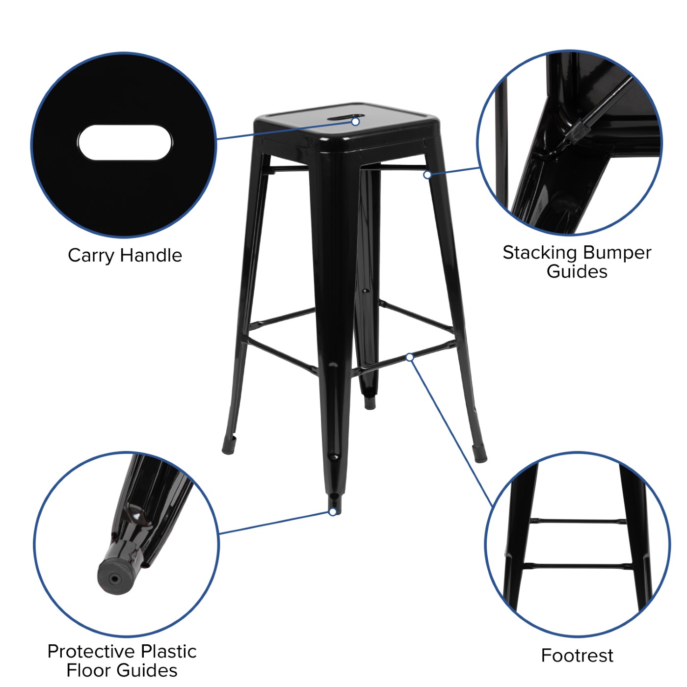 30" HIGH METAL INDOOR BAR STOOL IN BLACK - STACKABLE SET OF 4