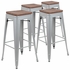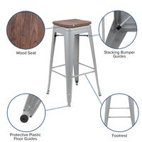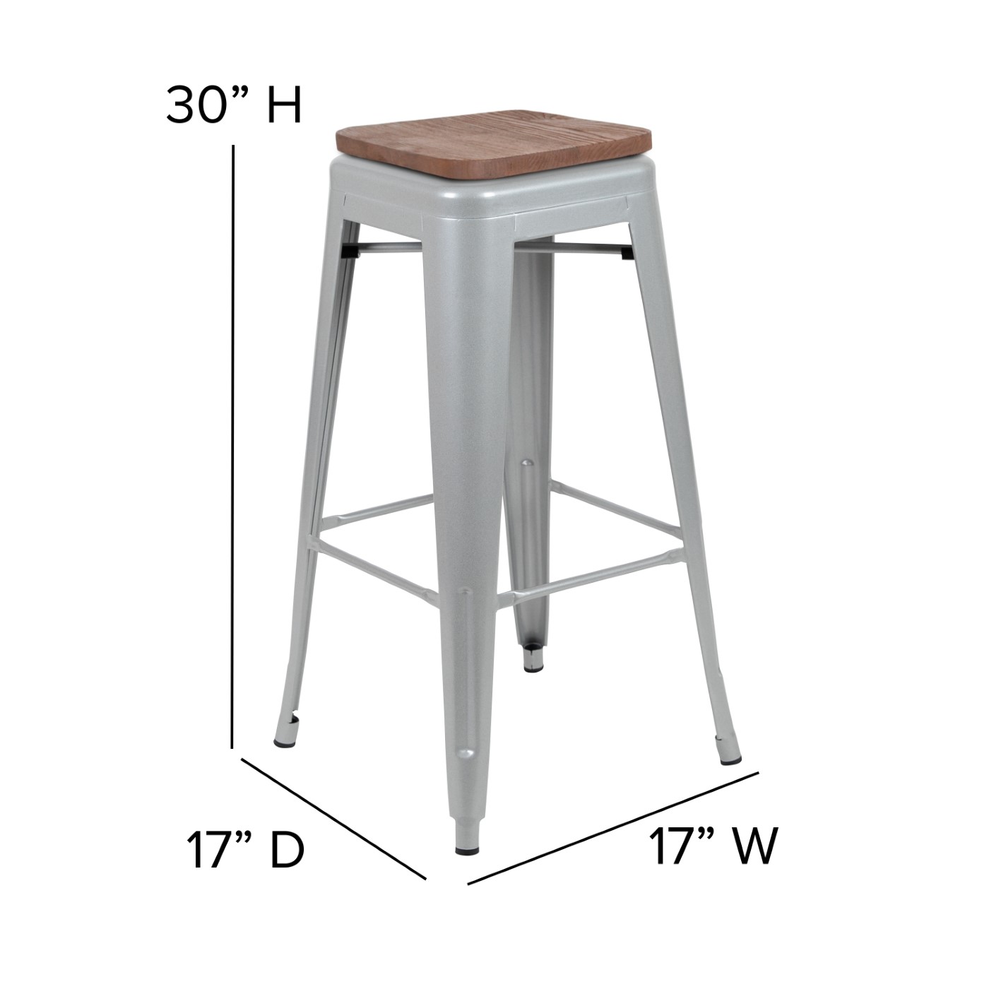30" HIGH METAL INDOOR BAR STOOL WITH WOOD SEAT IN SILVER - STACKABLE SET OF 4: FREE SHIPPING!