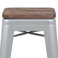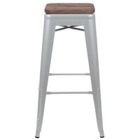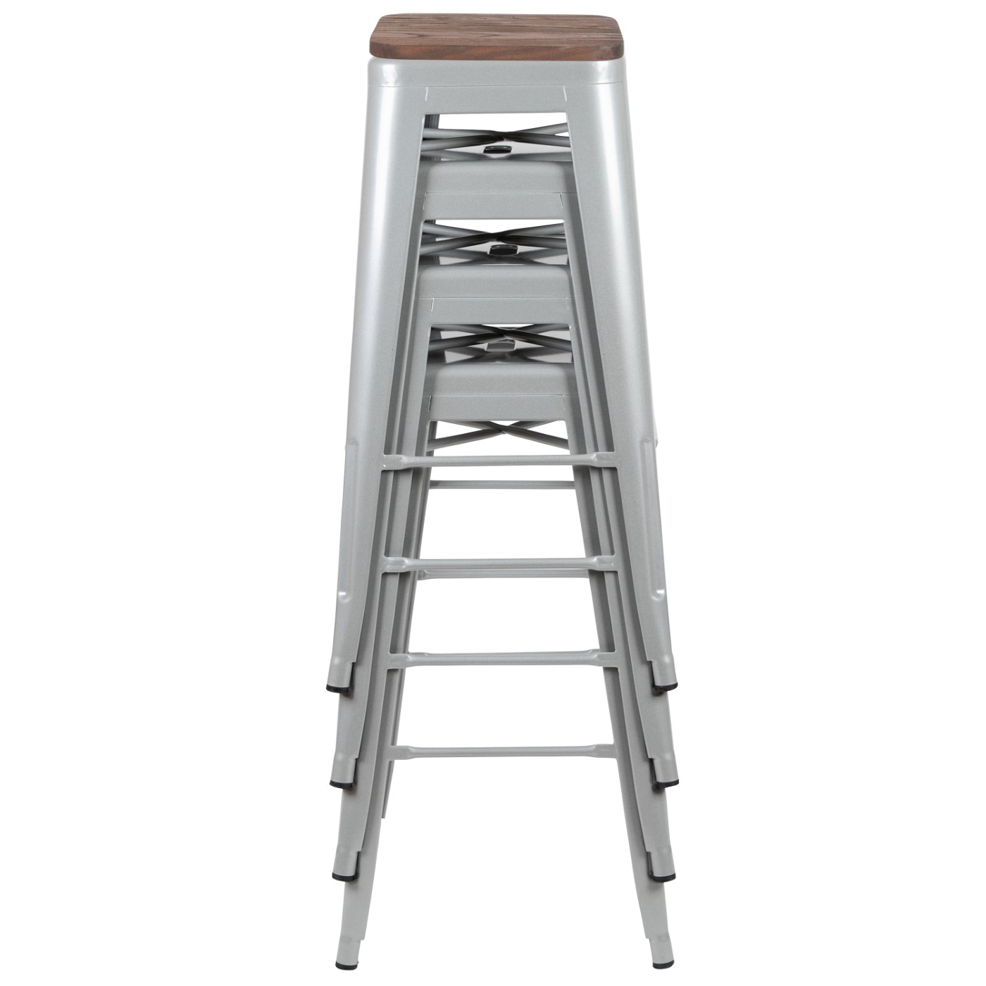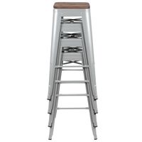 30" HIGH METAL INDOOR BAR STOOL WITH WOOD SEAT IN SILVER - STACKABLE SET OF 4
