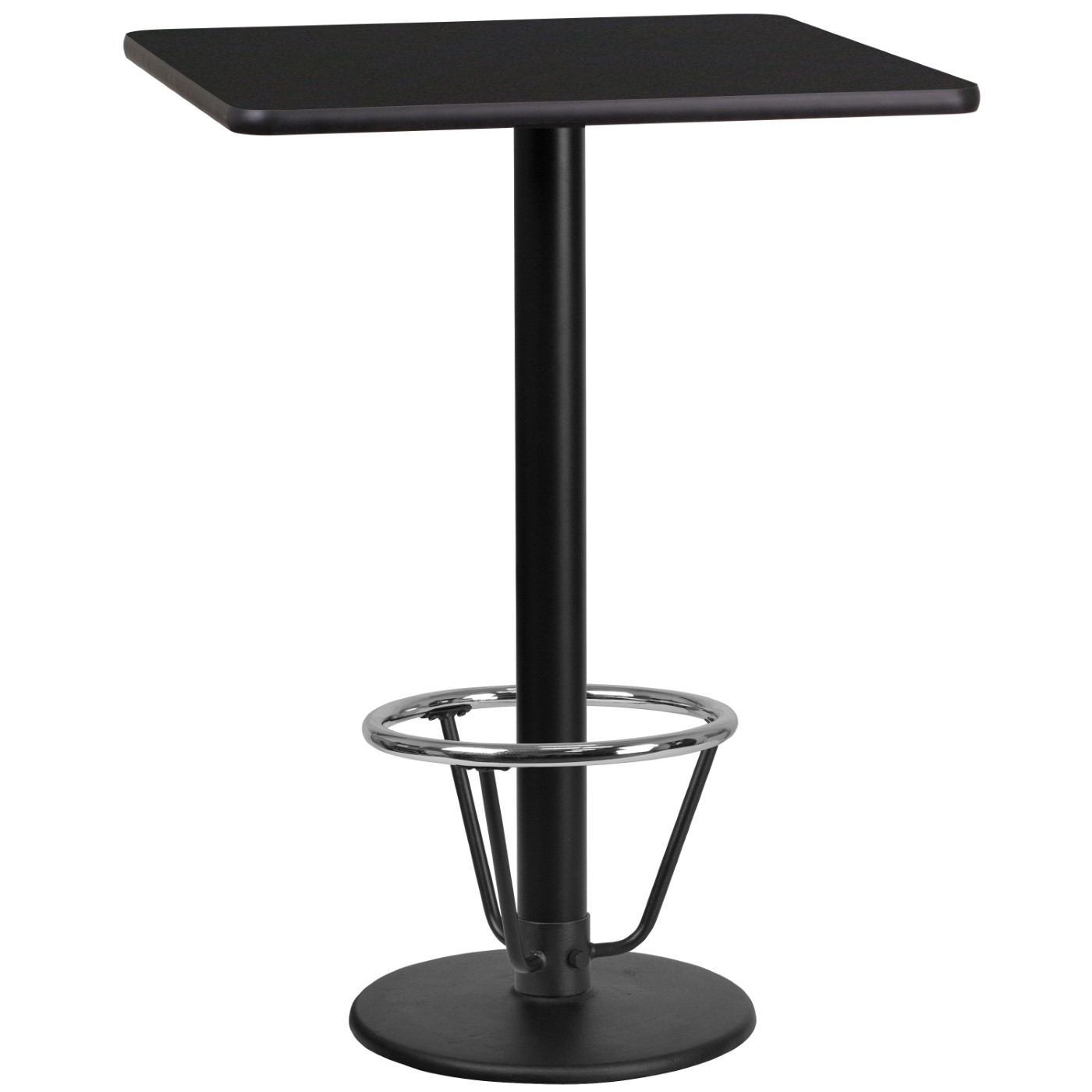 24'' SQUARE BLACK LAMINATE TABLE TOP WITH 18'' ROUND BAR HEIGHT TABLE BASE AND FOOT RING
