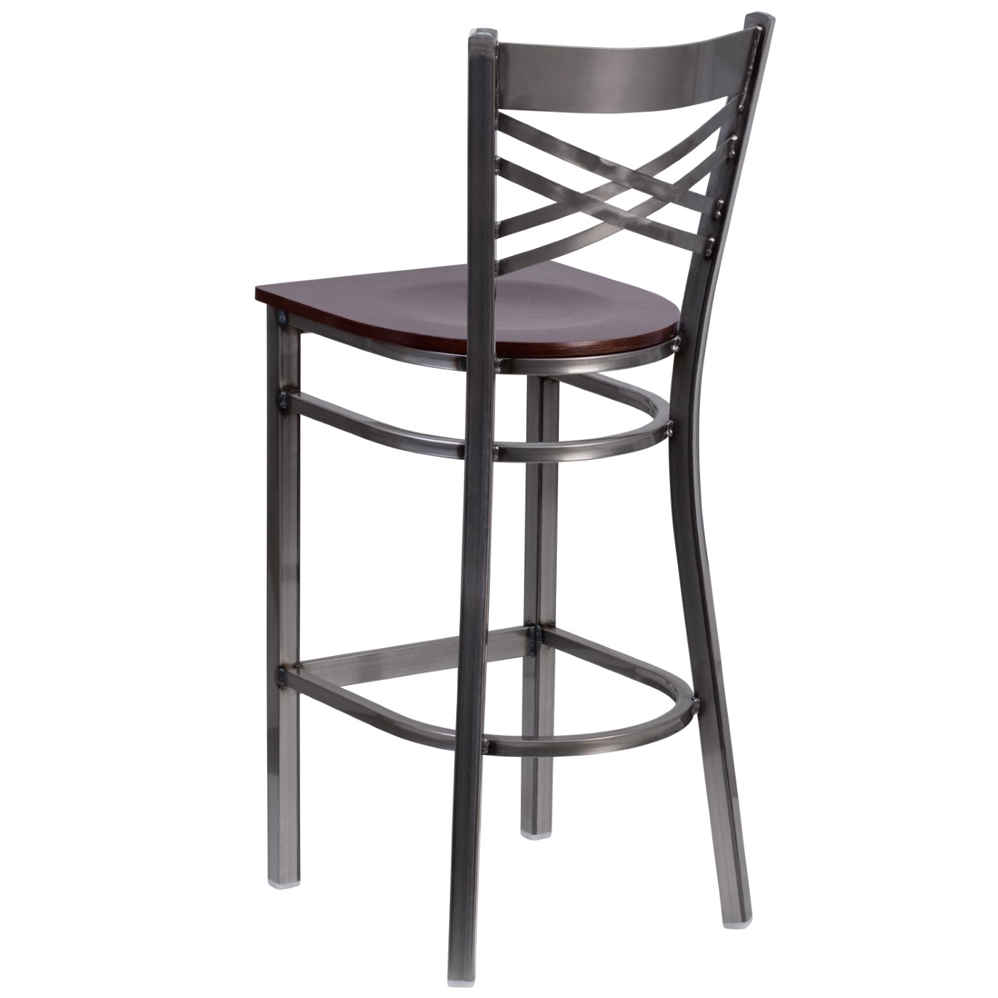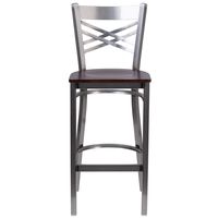 TOUGH ENOUGH SERIES CLEAR COATED ''X'' BACK METAL RESTAURANT BARSTOOL - WALNUT WOOD SEAT: FREE SHIPPING!
