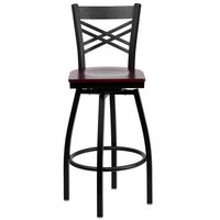 TOUGH ENOUGH SERIES BLACK ''X'' BACK SWIVEL METAL BARSTOOL - MAHOGANY WOOD SEAT
