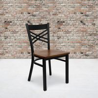 TOUGH ENOUGH SERIES BLACK ''X'' BACK METAL RESTAURANT CHAIR - CHERRY WOOD SEAT