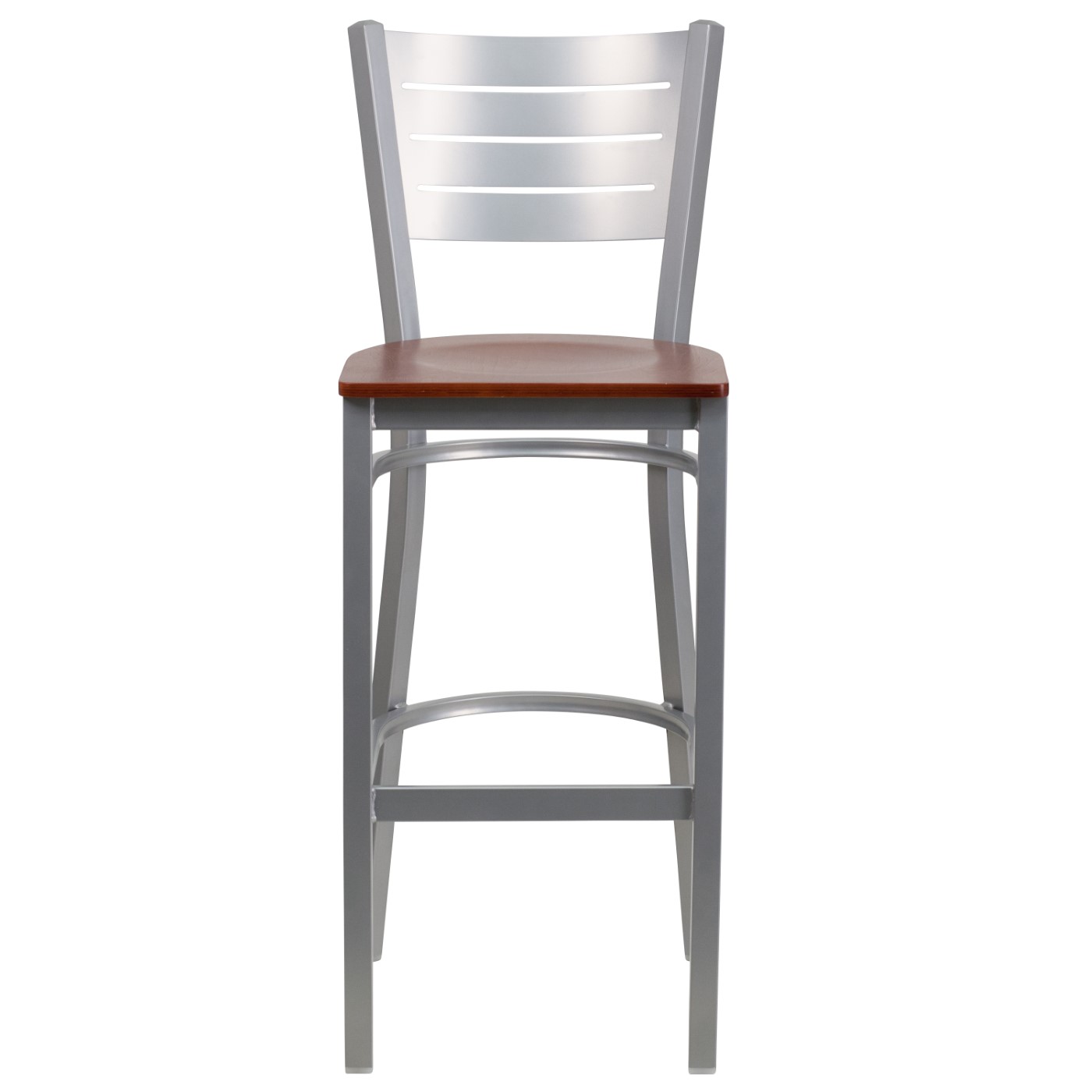TOUGH ENOUGH SERIES SILVER SLAT BACK METAL RESTAURANT BARSTOOL - CHERRY WOOD SEAT