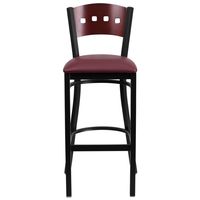 TOUGH ENOUGH SERIES BLACK 4 SQUARE BACK METAL RESTAURANT BARSTOOL - MAHOGANY WOOD BACK, BURGUNDY VINYL SEAT