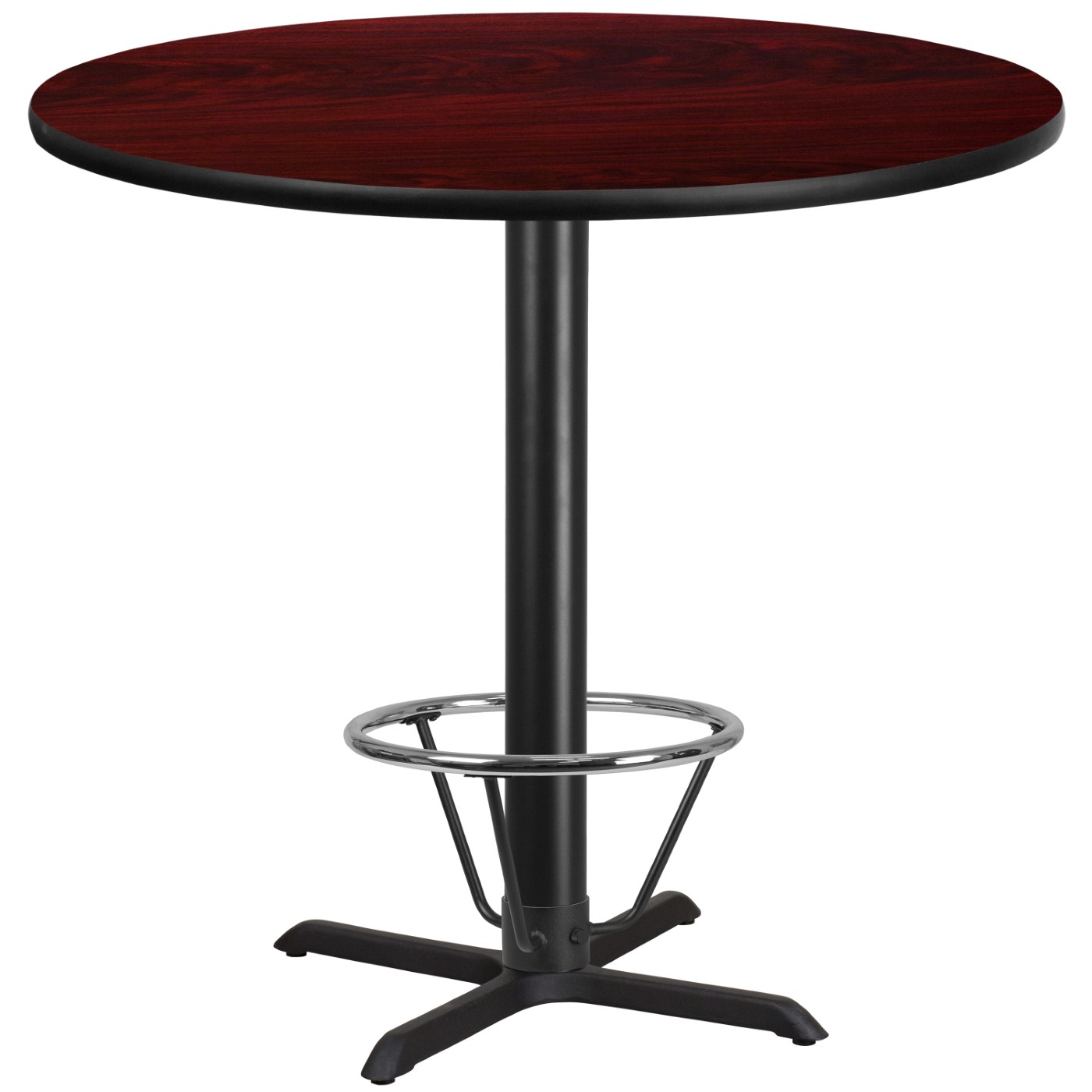 42'' ROUND MAHOGANY LAMINATE TABLE TOP WITH 33'' X 33'' BAR HEIGHT TABLE BASE AND FOOT RING