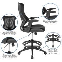 HIGH BACK DESIGNER BLACK MESH DRAFTING CHAIR WITH LEATHERSOFT SIDES AND ADJUSTABLE ARMS