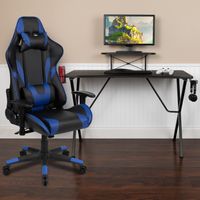 BLACK GAMING DESK AND BLUE RECLINING GAMING CHAIR SET WITH CUP HOLDER, HEADPHONE HOOK, AND MONITOR/SMARTPHONE STAND: FREE SHIPPING!