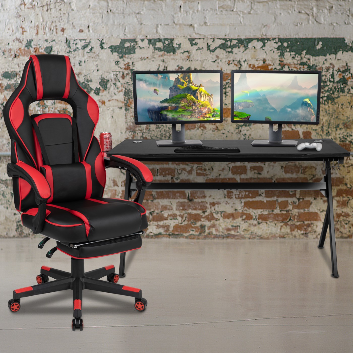 GAMING DESK WITH CUP HOLDER/HEADPHONE HOOK/REMOVABLE MOUSEPAD TOP & RED RECLINING BACK/ARMS GAMING CHAIR WITH FOOTREST