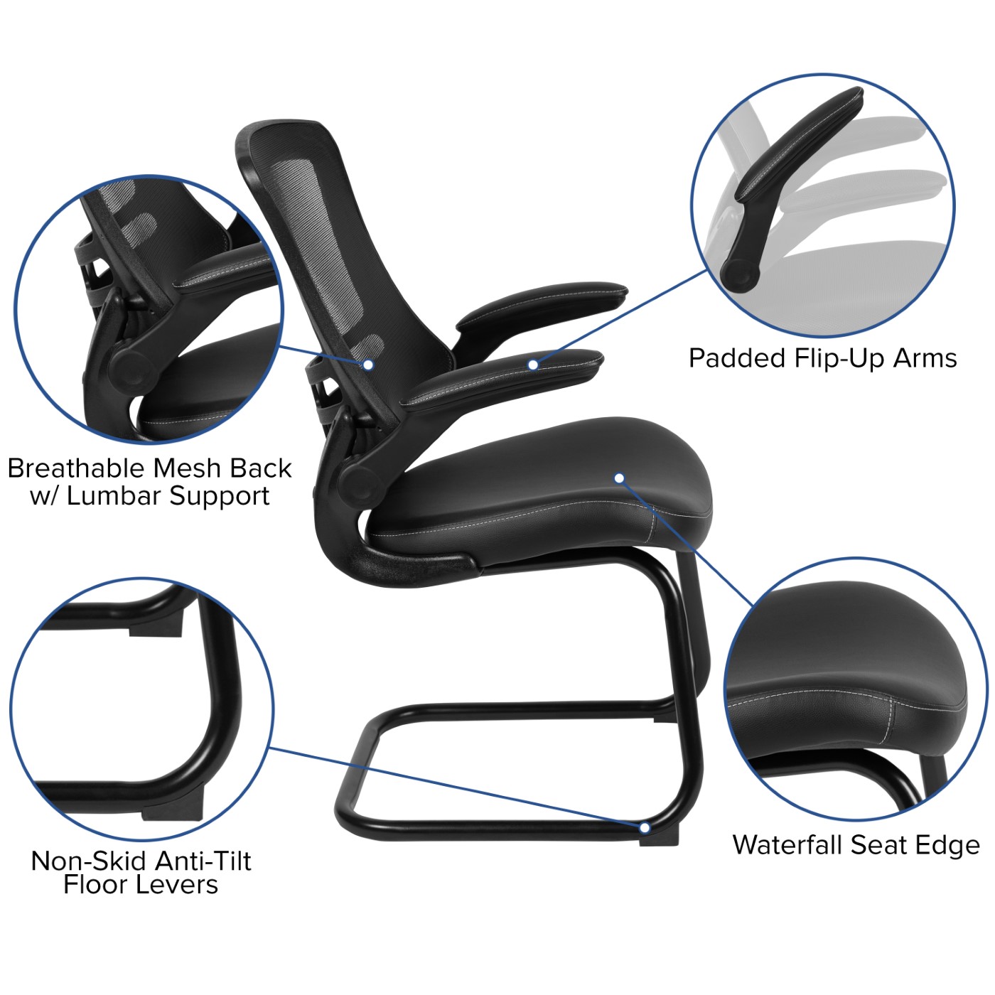BLACK MESH SLED BASE SIDE RECEPTION CHAIR WITH WHITE STITCHED LEATHERSOFT SEAT AND FLIP-UP ARMS