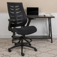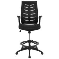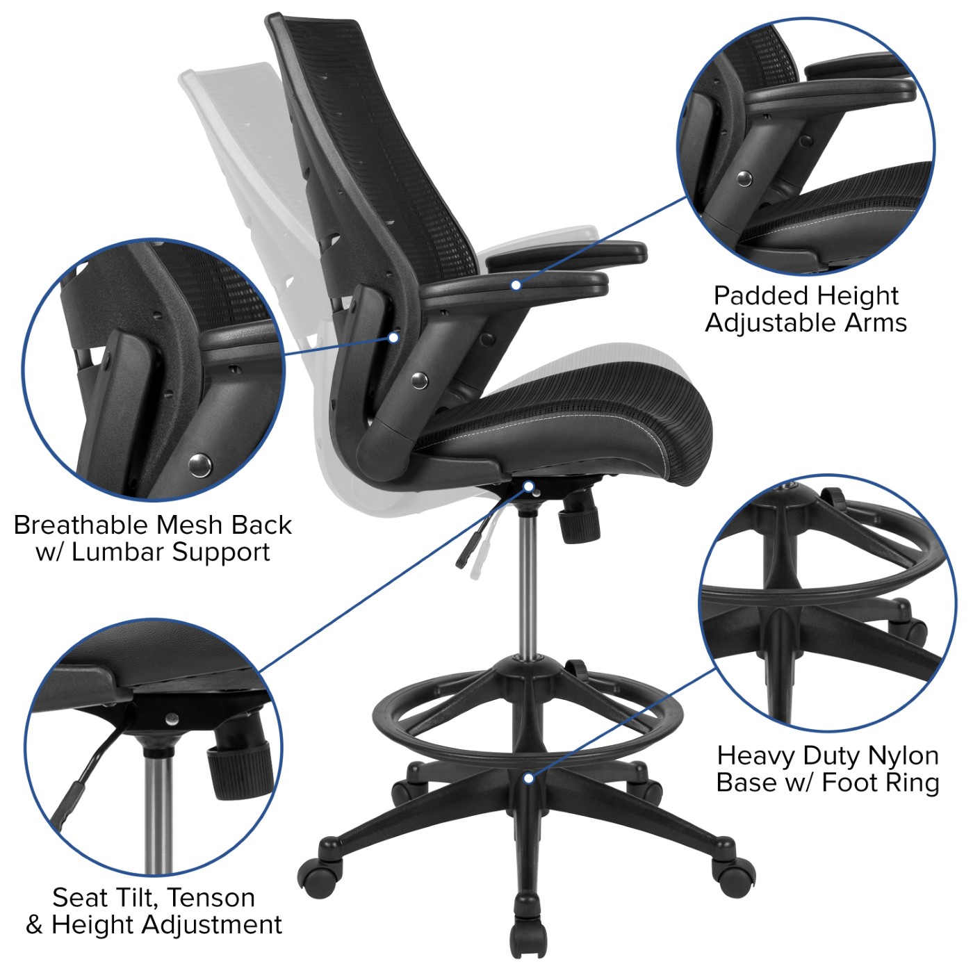 HIGH BACK BLACK MESH SPINE-BACK ERGONOMIC DRAFTING CHAIR WITH ADJUSTABLE FOOT RING AND ADJUSTABLE FLIP-UP ARMS