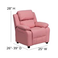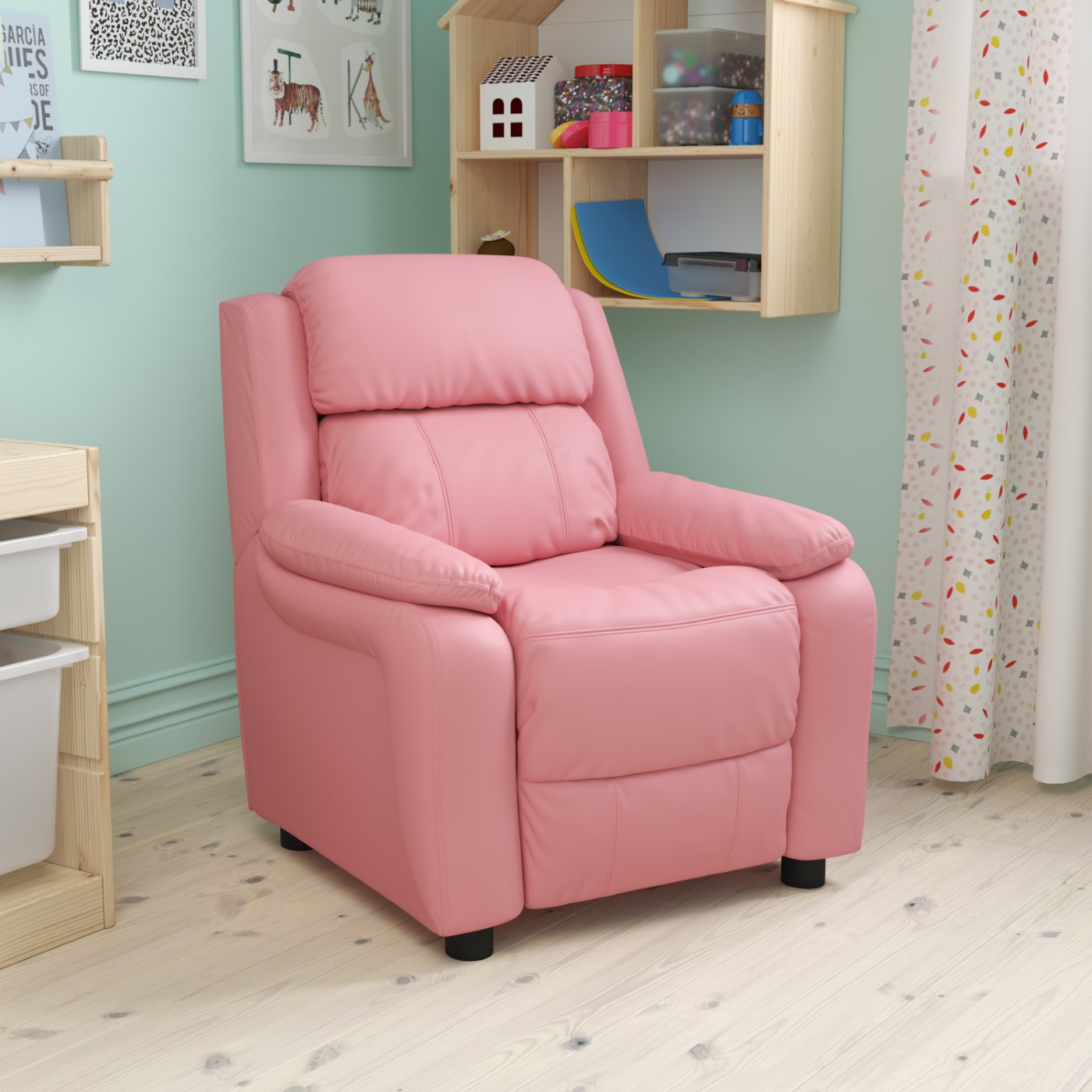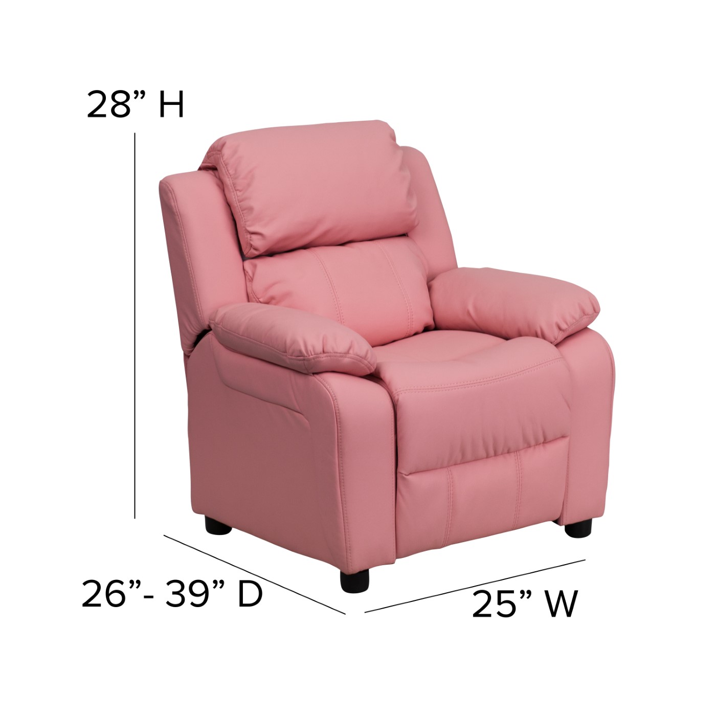 DELUXE PADDED CONTEMPORARY PINK VINYL KIDS RECLINER WITH STORAGE ARMS