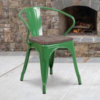 GREEN METAL CHAIR WITH WOOD SEAT AND ARMS