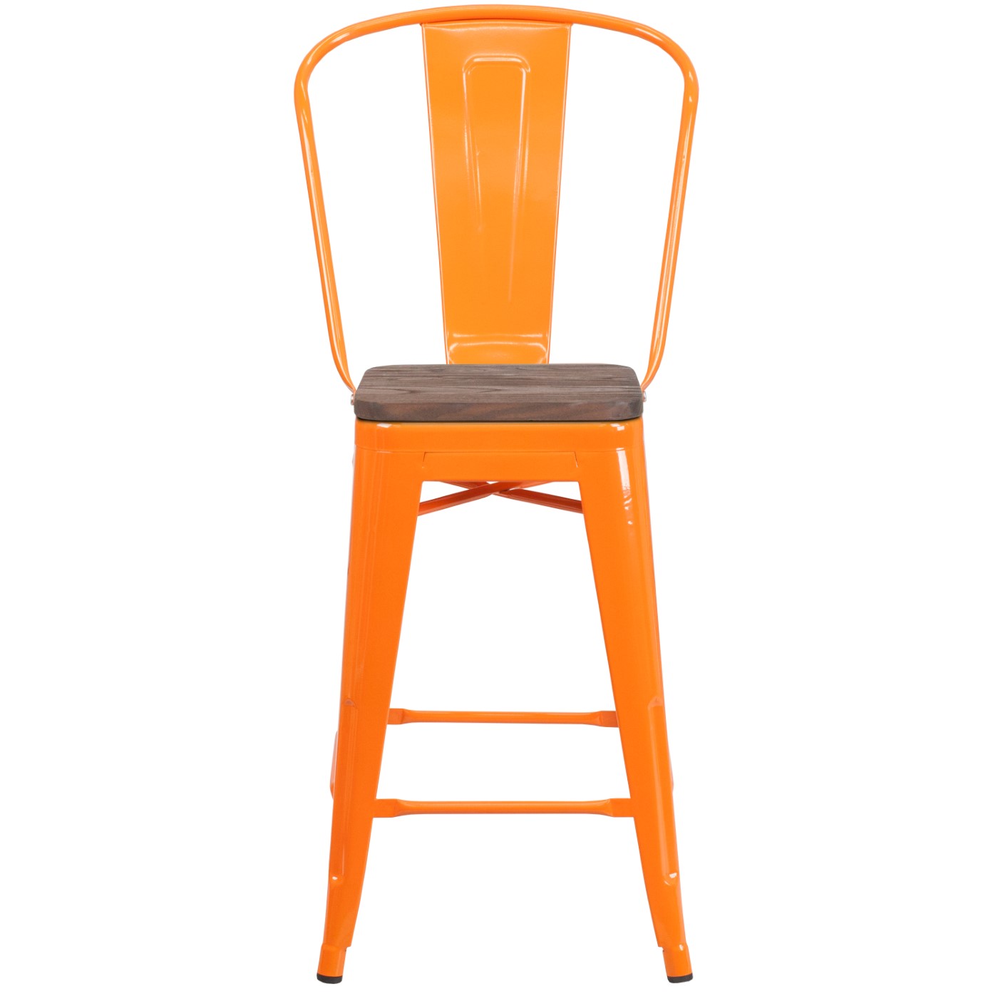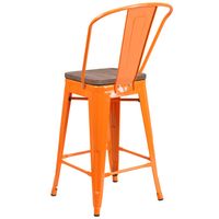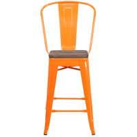 24" HIGH ORANGE METAL COUNTER HEIGHT STOOL WITH BACK AND WOOD SEAT: FREE SHIPPING!