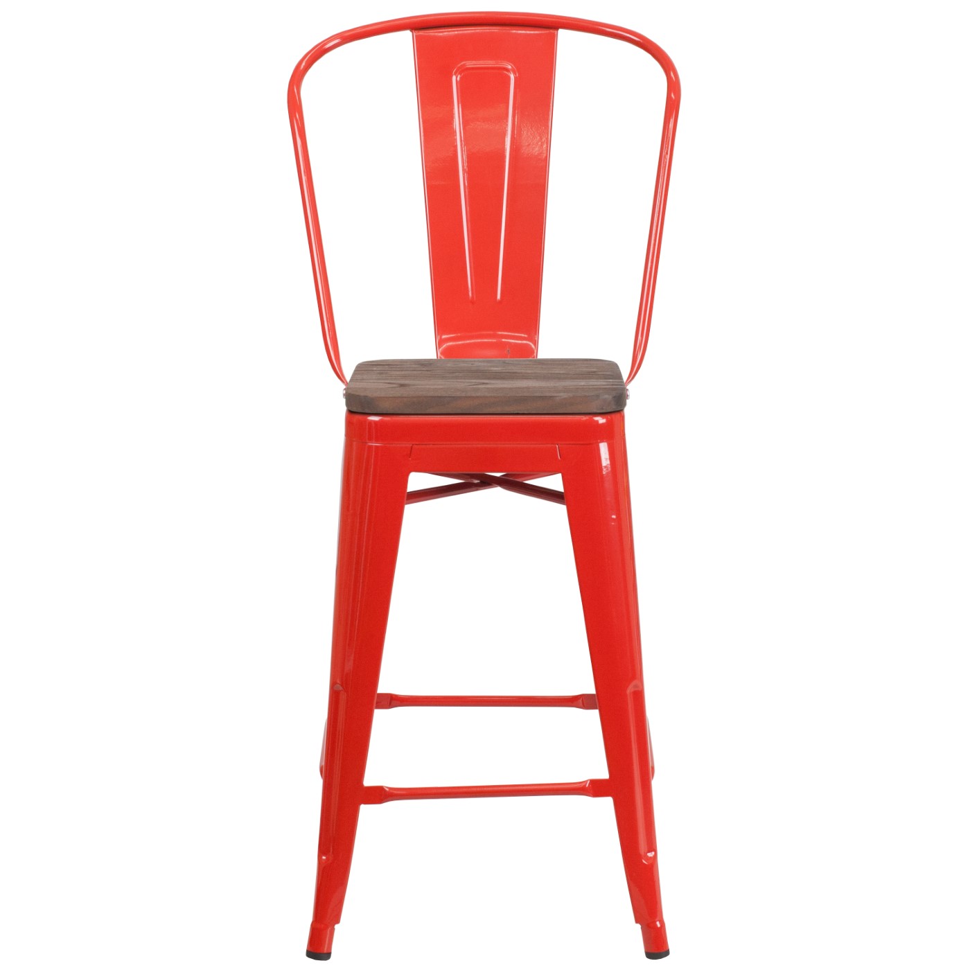 24" HIGH RED METAL COUNTER HEIGHT STOOL WITH BACK AND WOOD SEAT: FREE SHIPPING!