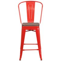 24" HIGH RED METAL COUNTER HEIGHT STOOL WITH BACK AND WOOD SEAT
