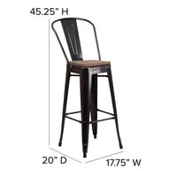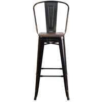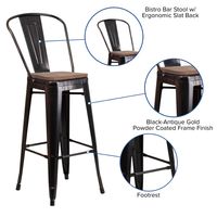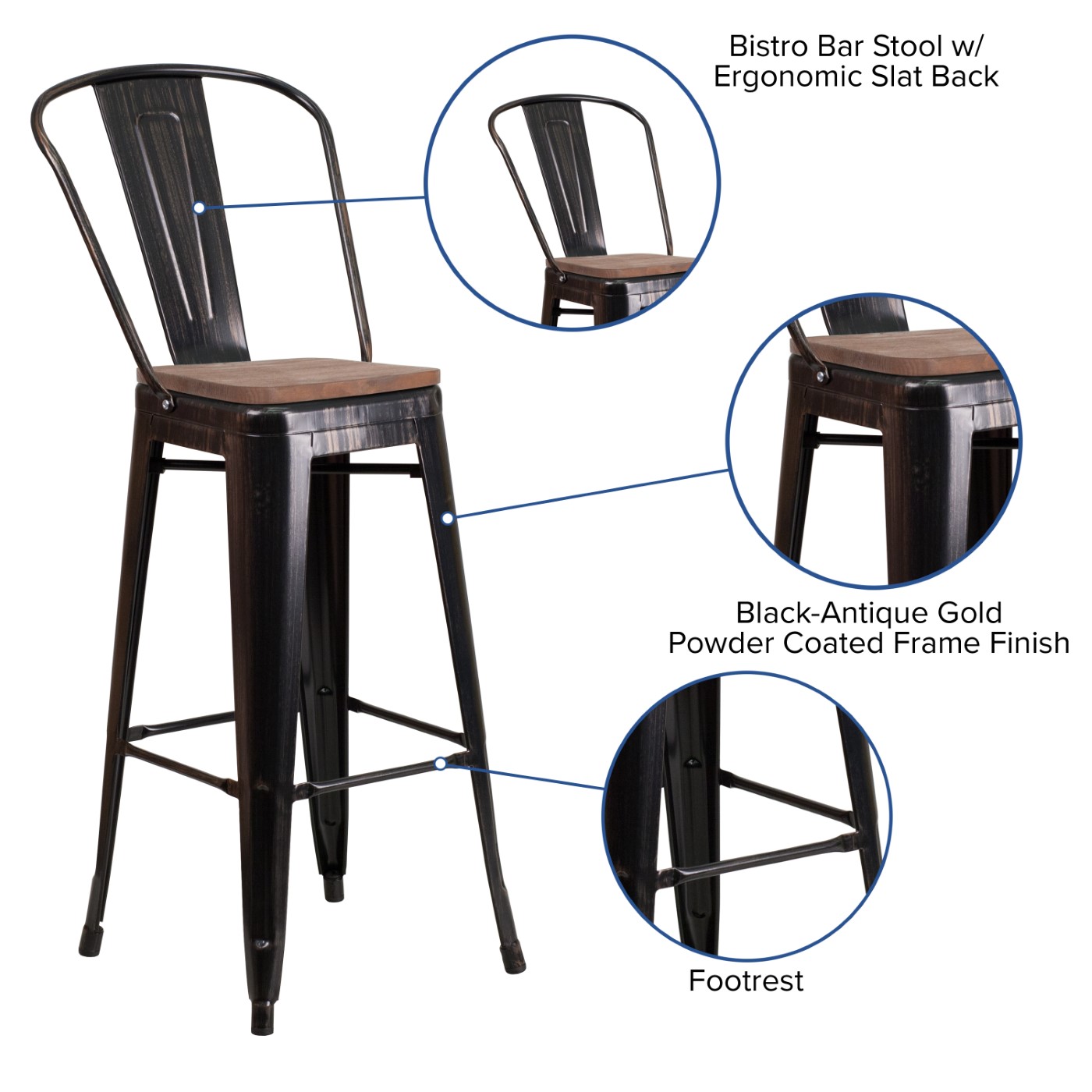 30" HIGH BLACK-ANTIQUE GOLD METAL BARSTOOL WITH BACK AND WOOD SEAT