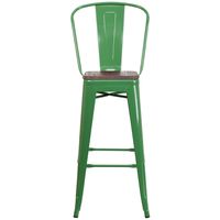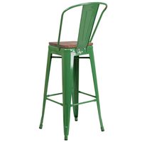 30" HIGH GREEN METAL BARSTOOL WITH BACK AND WOOD SEAT
