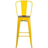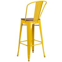 30" HIGH YELLOW METAL BARSTOOL WITH BACK AND WOOD SEAT