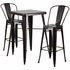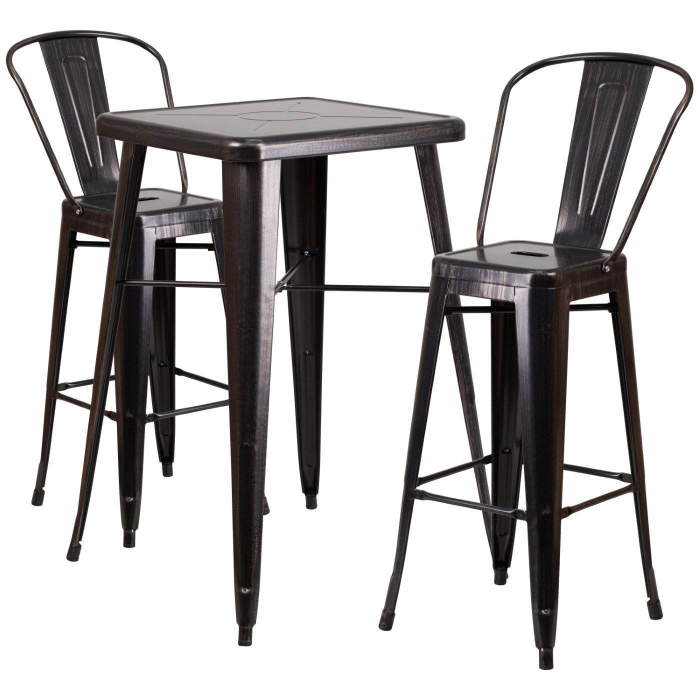 COMMERCIAL GRADE 23.75" SQUARE BLACK-ANTIQUE GOLD METAL INDOOR-OUTDOOR BAR TABLE SET WITH 2 STOOLS WITH BACKS