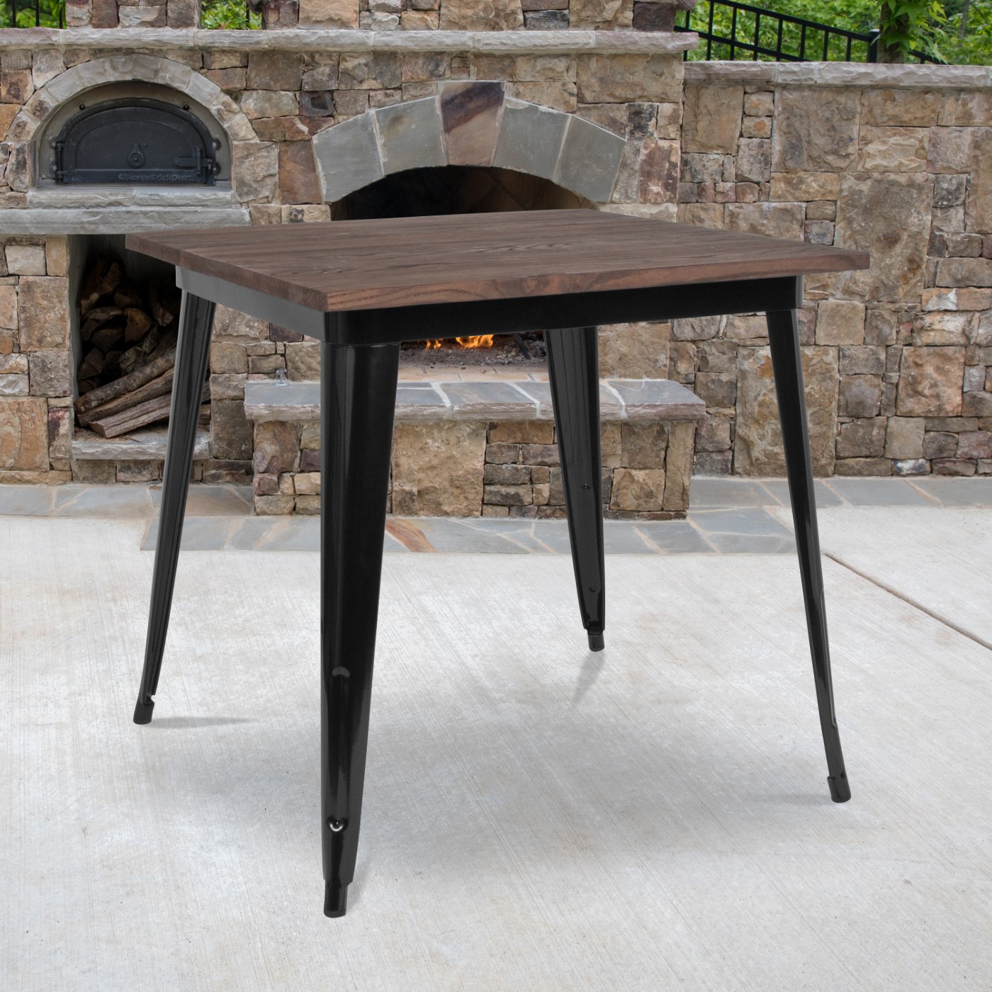 31.5" SQUARE BLACK METAL INDOOR TABLE WITH WALNUT RUSTIC WOOD TOP
