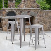 COMMERCIAL GRADE 24" ROUND SILVER METAL INDOOR-OUTDOOR BAR TABLE SET WITH 2 SQUARE SEAT BACKLESS STOOLS