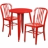 COMMERCIAL GRADE 24" ROUND RED METAL INDOOR-OUTDOOR TABLE SET WITH 2 VERTICAL SLAT BACK CHAIRS