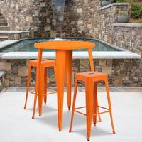 COMMERCIAL GRADE 30" ROUND ORANGE METAL INDOOR-OUTDOOR BAR TABLE SET WITH 2 SQUARE SEAT BACKLESS STOOLS