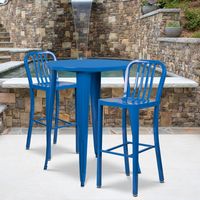 COMMERCIAL GRADE 30" ROUND BLUE METAL INDOOR-OUTDOOR BAR TABLE SET WITH 2 VERTICAL SLAT BACK STOOLS