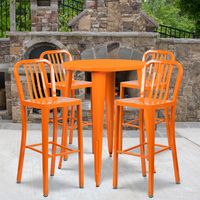 COMMERCIAL GRADE 30" ROUND ORANGE METAL INDOOR-OUTDOOR BAR TABLE SET WITH 4 VERTICAL SLAT BACK STOOLS