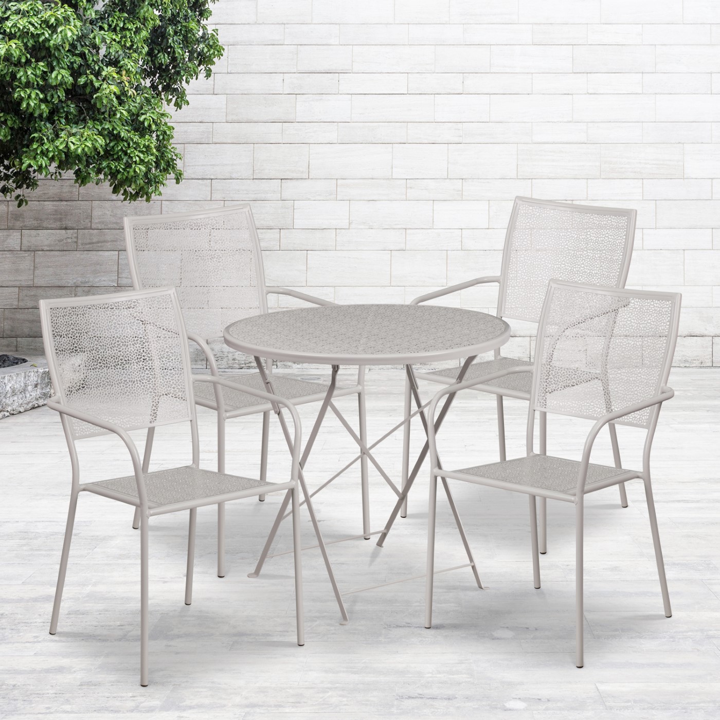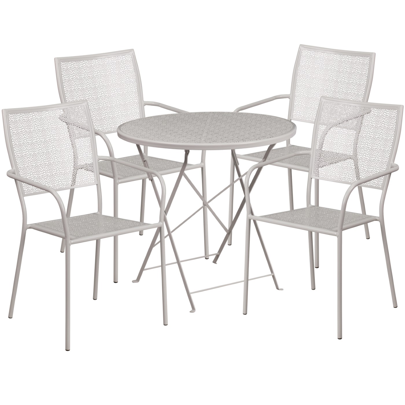 COMMERCIAL GRADE 30" ROUND LIGHT GRAY INDOOR-OUTDOOR STEEL FOLDING PATIO TABLE SET WITH 4 SQUARE BACK CHAIRS