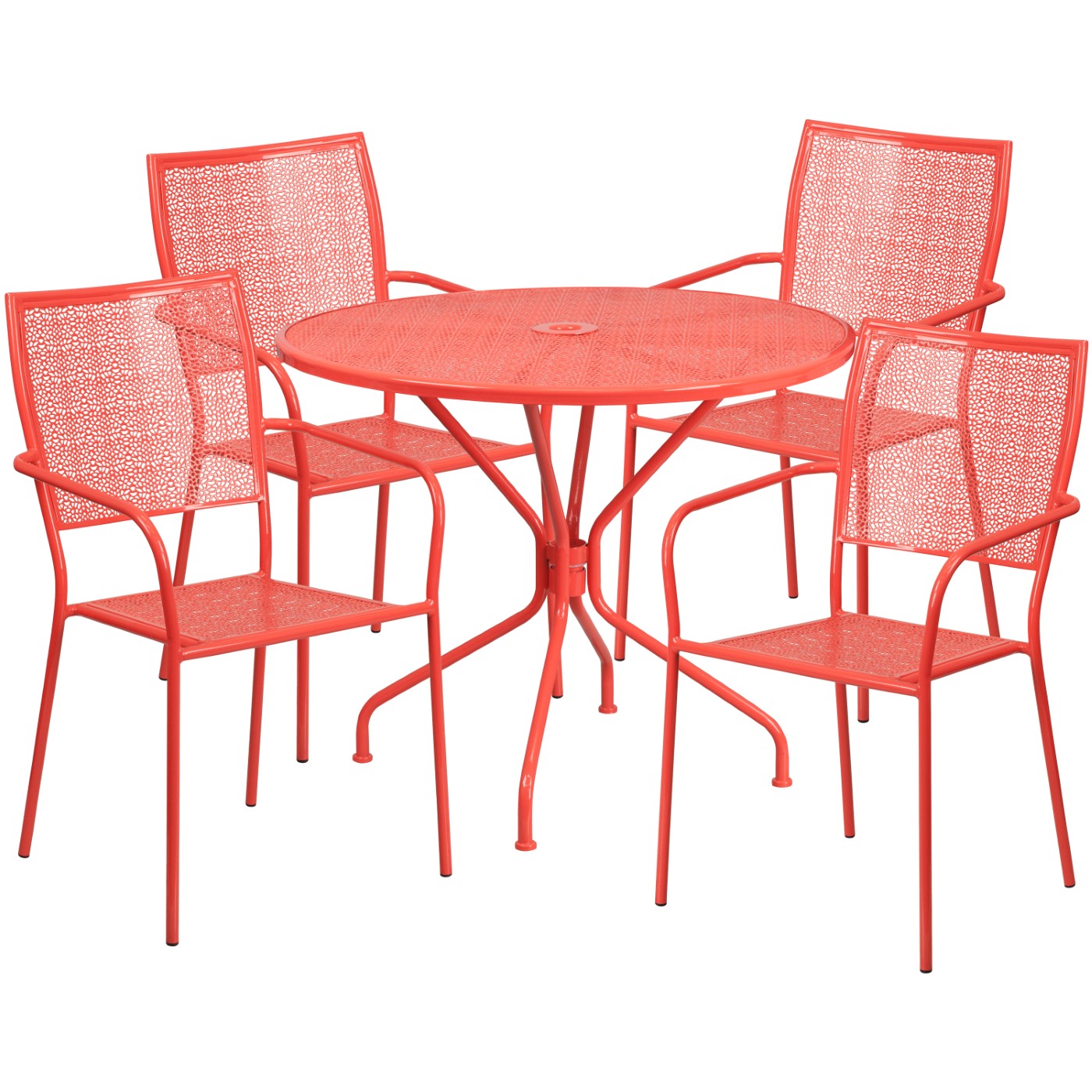 COMMERCIAL GRADE 35.25" ROUND CORAL INDOOR-OUTDOOR STEEL PATIO TABLE SET WITH 4 SQUARE BACK CHAIRS