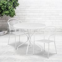 COMMERCIAL GRADE 35.25" ROUND WHITE INDOOR-OUTDOOR STEEL PATIO TABLE SET WITH 2 ROUND BACK CHAIRS