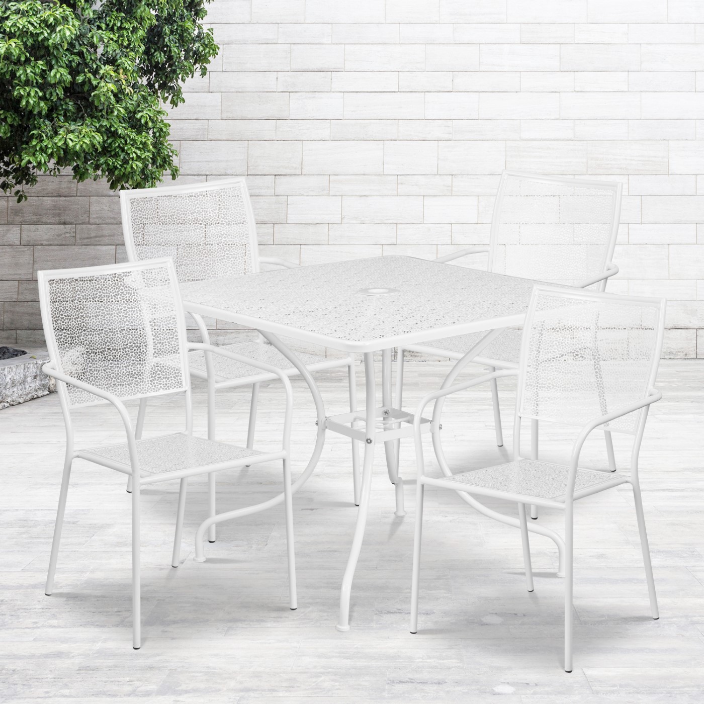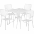 COMMERCIAL GRADE 35.5" SQUARE WHITE INDOOR-OUTDOOR STEEL PATIO TABLE SET WITH 4 SQUARE BACK CHAIRS