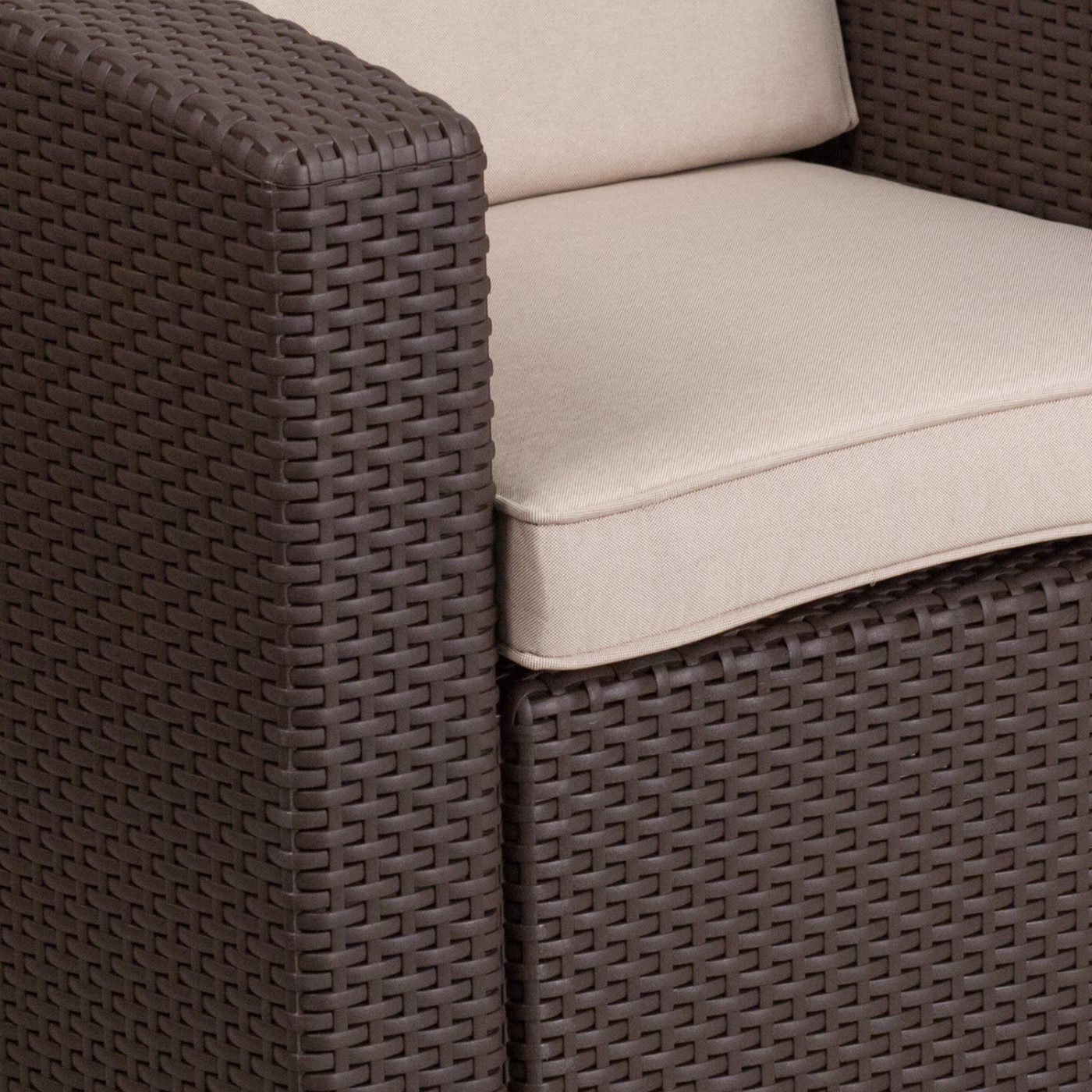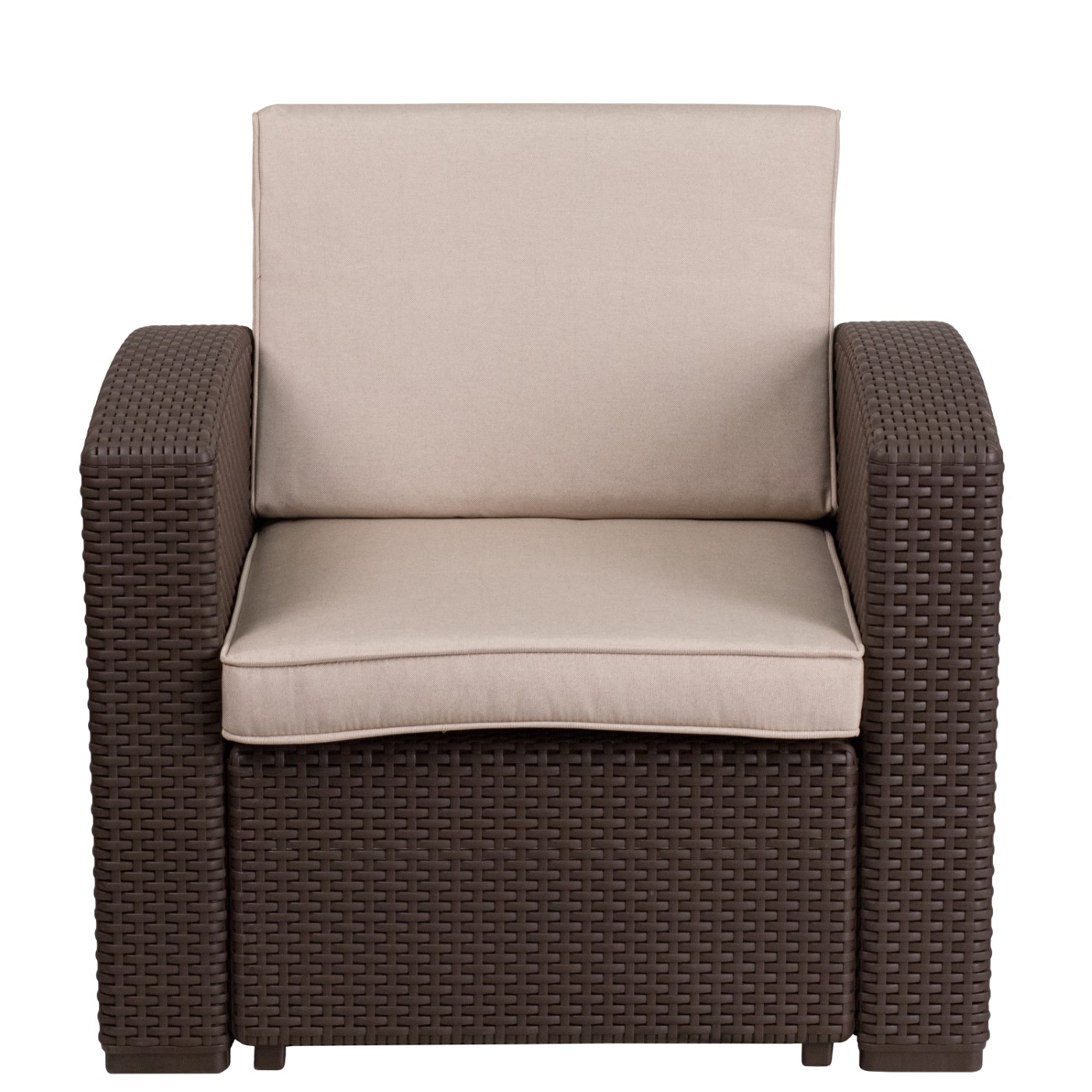 CHOCOLATE BROWN FAUX RATTAN CHAIR WITH ALL-WEATHER BEIGE CUSHION