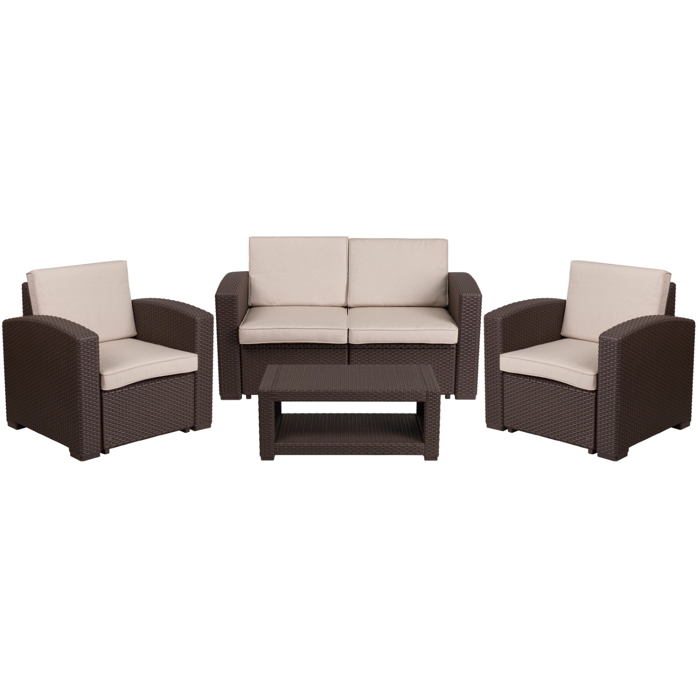 4 PIECE OUTDOOR FAUX RATTAN CHAIR, LOVESEAT AND TABLE SET IN CHOCOLATE BROWN