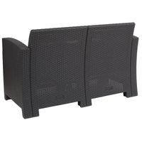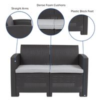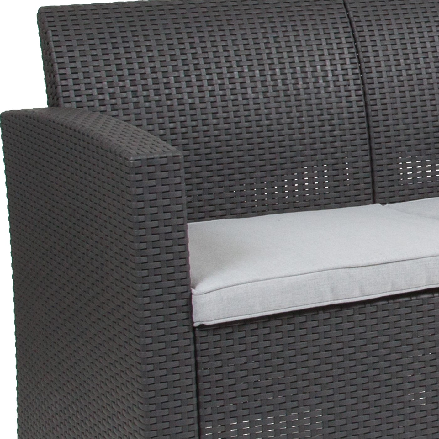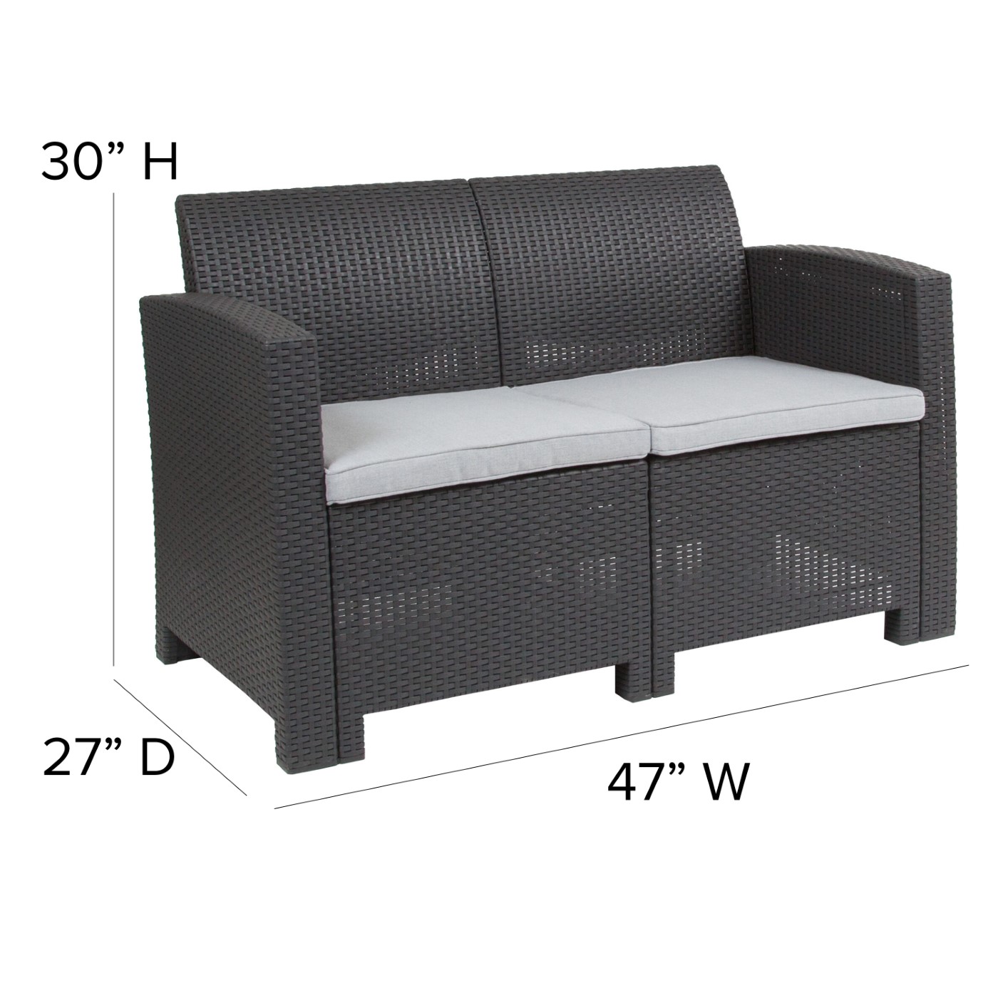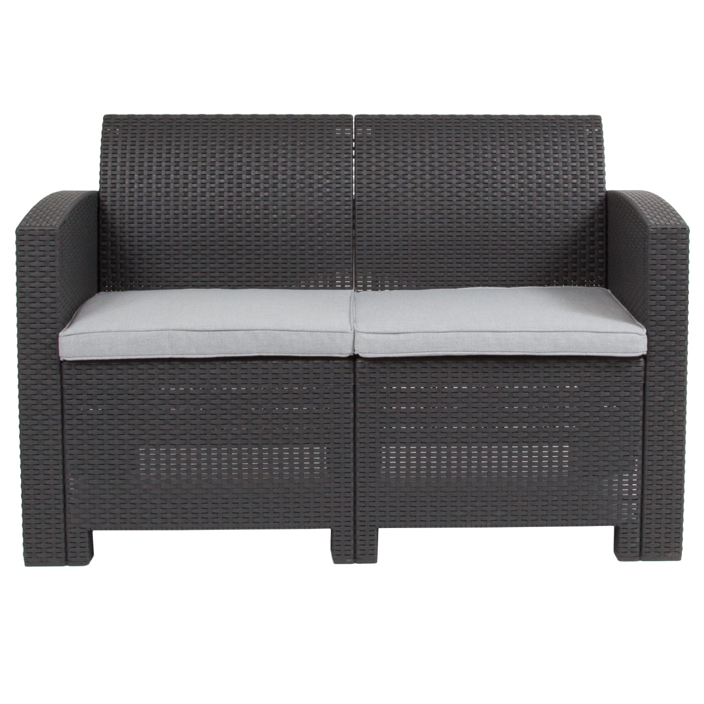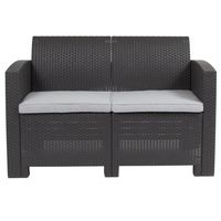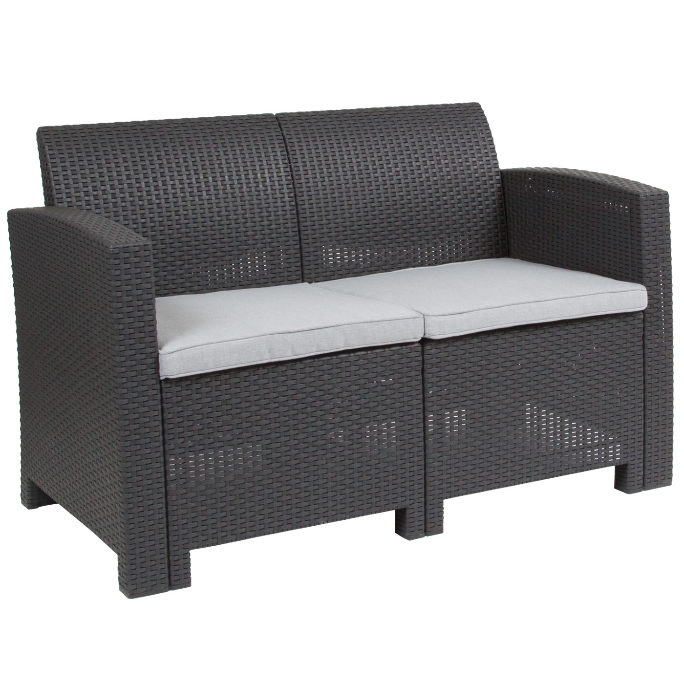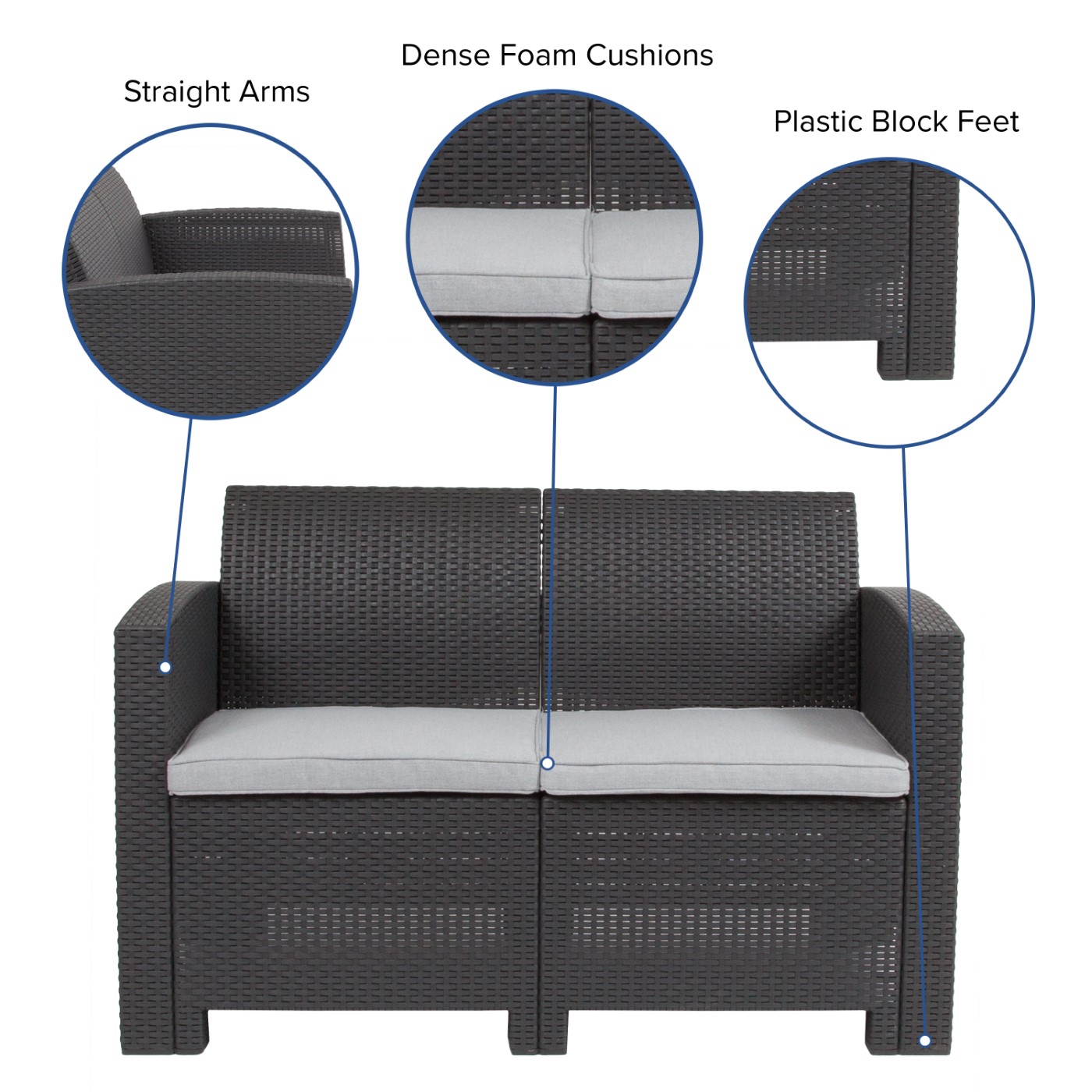 DARK GRAY FAUX RATTAN LOVESEAT WITH ALL-WEATHER LIGHT GRAY CUSHIONS