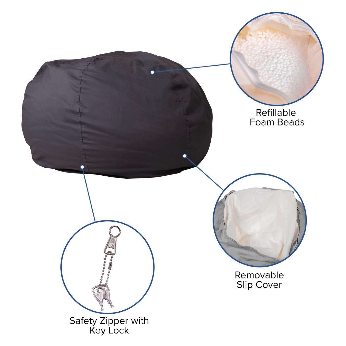 - Safety Metal Zipper secures polystyrene polymeric beads