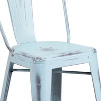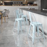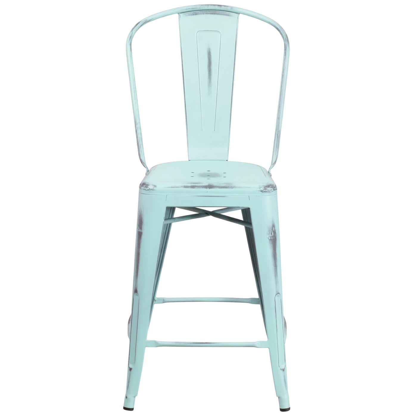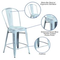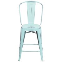 COMMERCIAL GRADE 24" HIGH DISTRESSED GREEN-BLUE METAL INDOOR-OUTDOOR COUNTER HEIGHT STOOL WITH BACK: FREE SHIPPING!