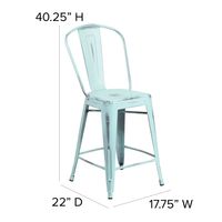 COMMERCIAL GRADE 24" HIGH DISTRESSED GREEN-BLUE METAL INDOOR-OUTDOOR COUNTER HEIGHT STOOL WITH BACK