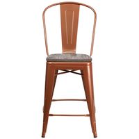 24" HIGH COPPER METAL COUNTER HEIGHT STOOL WITH BACK AND WOOD SEAT
