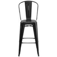 COMMERCIAL GRADE 30" HIGH DISTRESSED BLACK METAL INDOOR-OUTDOOR BARSTOOL WITH BACK