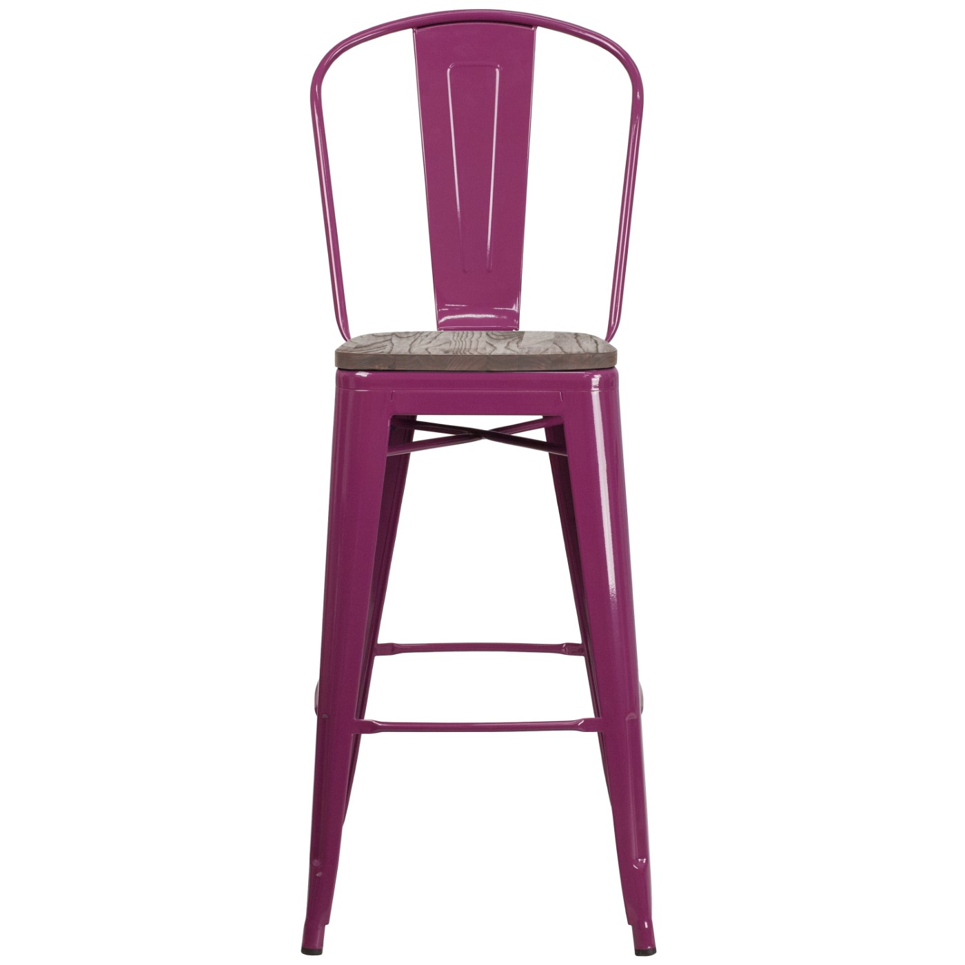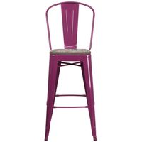 30" HIGH PURPLE METAL BARSTOOL WITH BACK AND WOOD SEAT