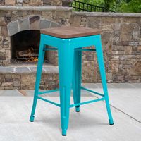 24" HIGH BACKLESS CRYSTAL TEAL-BLUE COUNTER HEIGHT STOOL WITH SQUARE WOOD SEAT: FREE SHIPPING!
