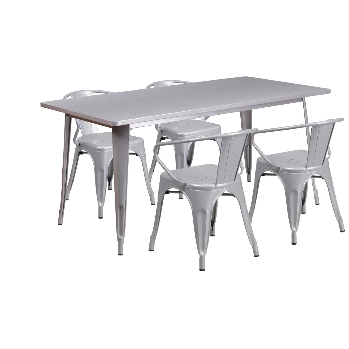 COMMERCIAL GRADE 31.5" X 63" RECTANGULAR SILVER METAL INDOOR-OUTDOOR TABLE SET WITH 4 ARM CHAIRS: FREE SHIPPING!