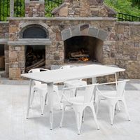 COMMERCIAL GRADE 31.5" X 63" RECTANGULAR WHITE METAL INDOOR-OUTDOOR TABLE SET WITH 4 ARM CHAIRS