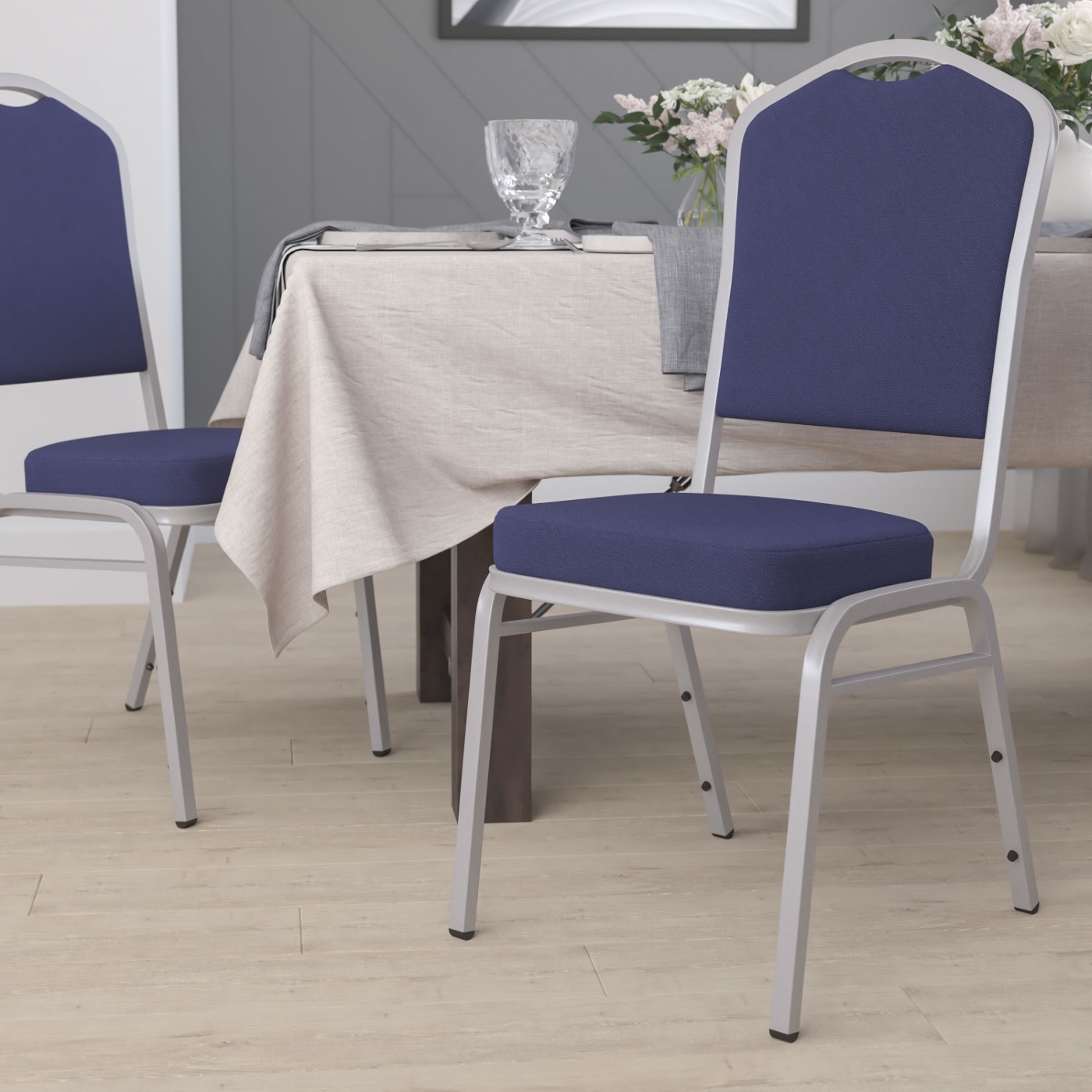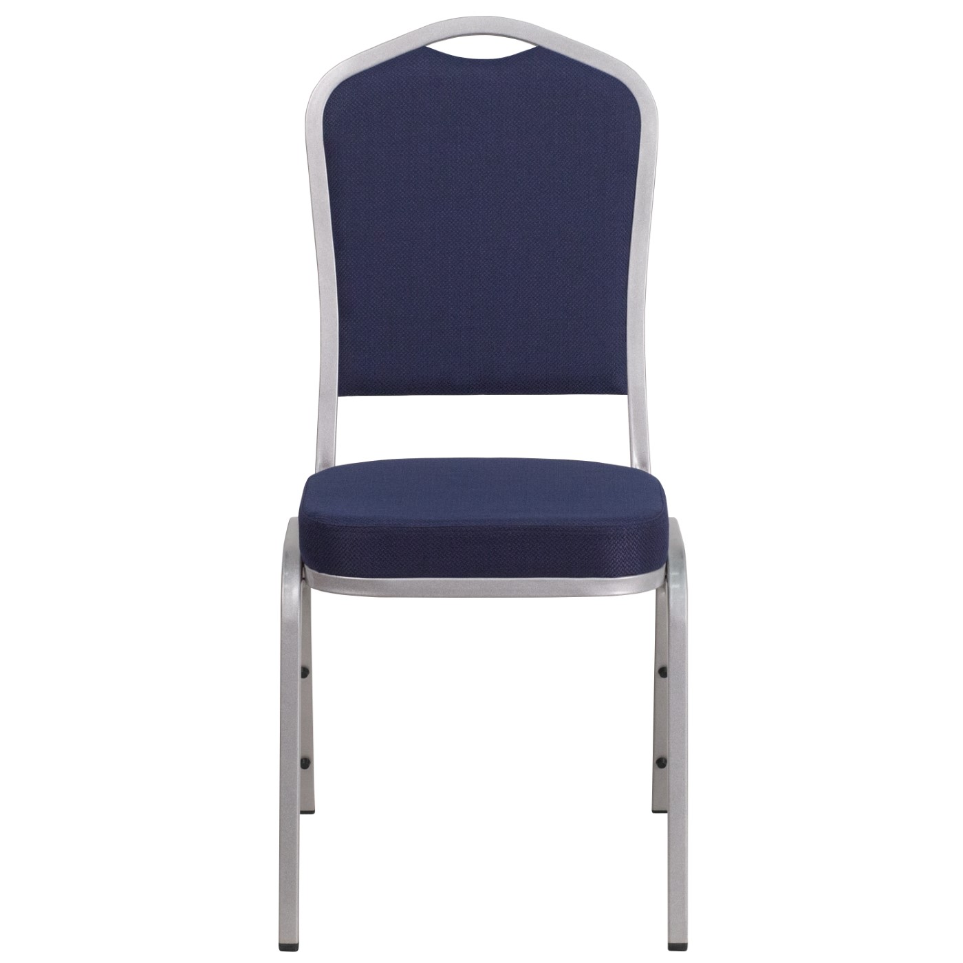 TOUGH ENOUGH SERIES CROWN BACK STACKING BANQUET CHAIR IN NAVY FABRIC - SILVER FRAME: FREE SHIPPING!