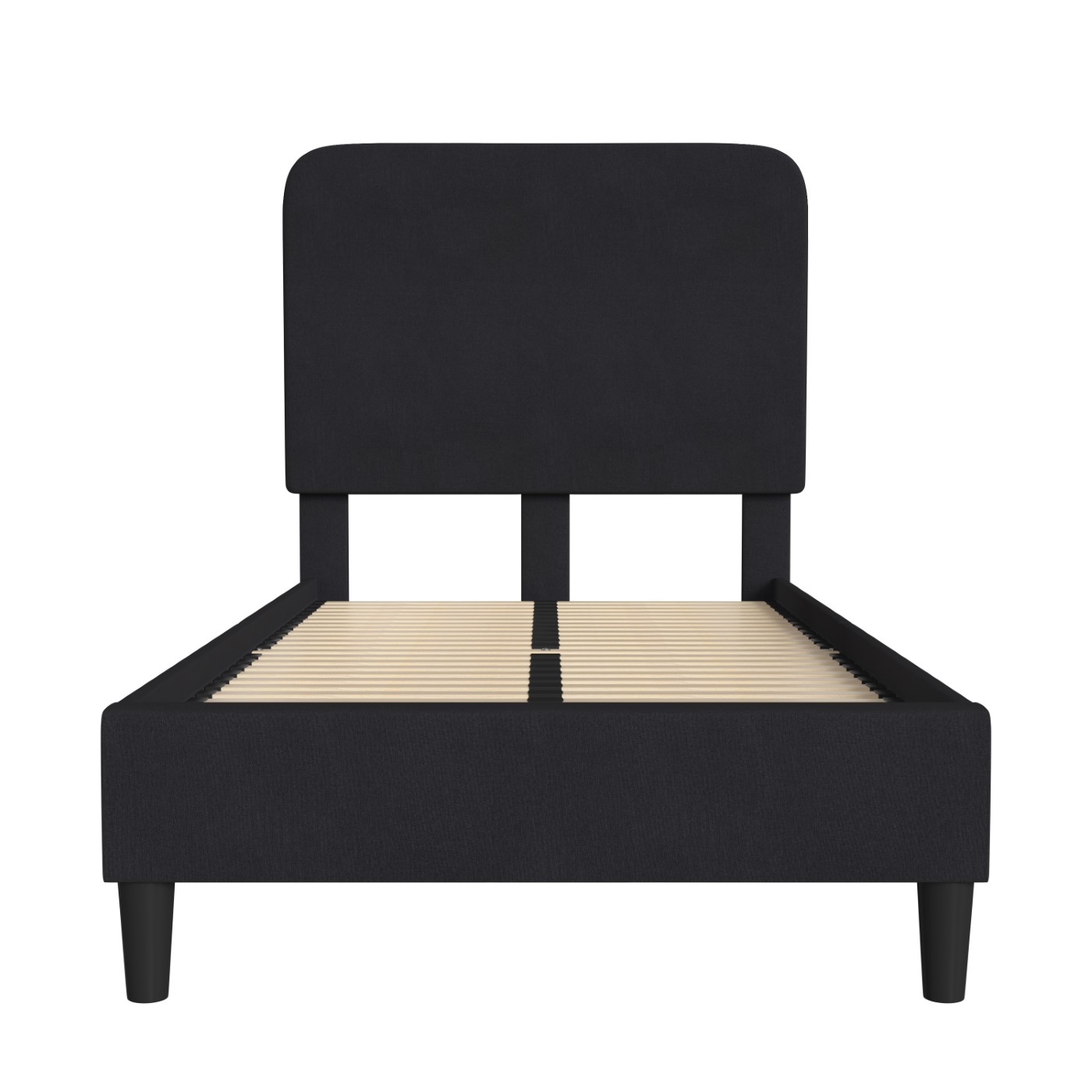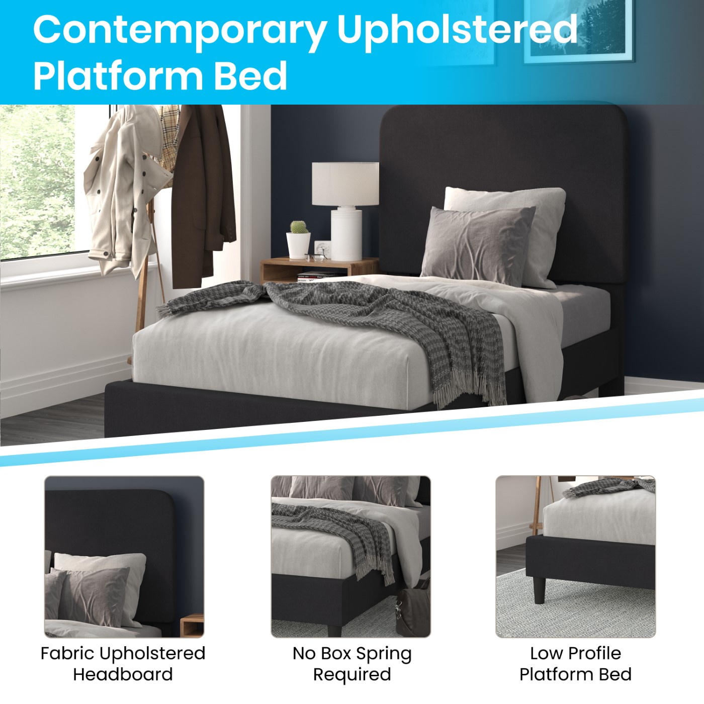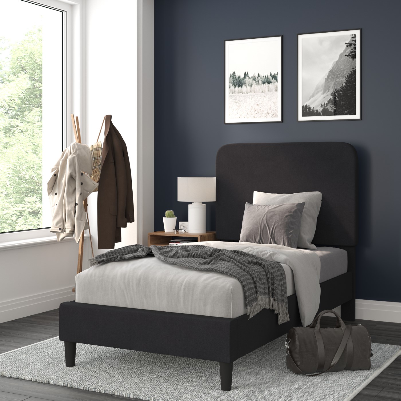 ADDISON CHARCOAL TWIN FABRIC UPHOLSTERED PLATFORM BED - HEADBOARD WITH ROUNDED EDGES - NO BOX SPRING OR FOUNDATION NEEDED