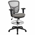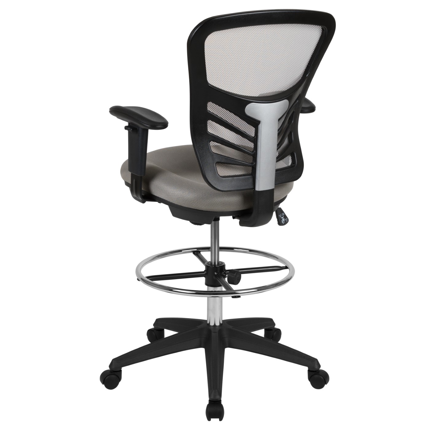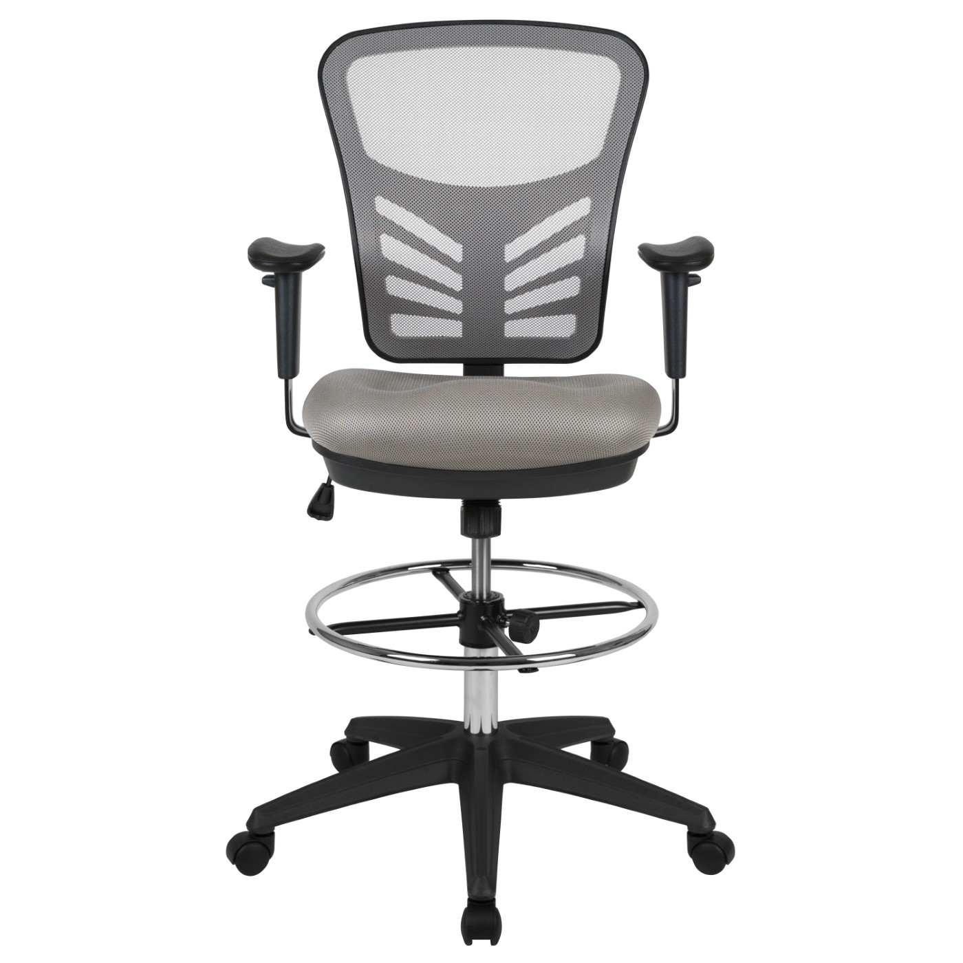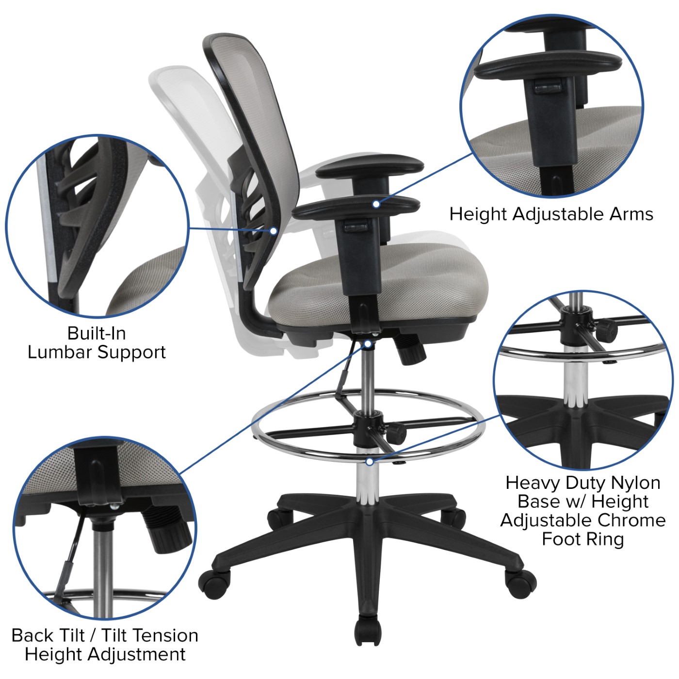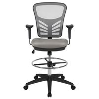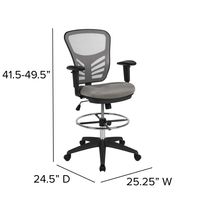 MID-BACK LIGHT GRAY MESH ERGONOMIC DRAFTING CHAIR WITH ADJUSTABLE CHROME FOOT RING, ADJUSTABLE ARMS AND BLACK FRAME